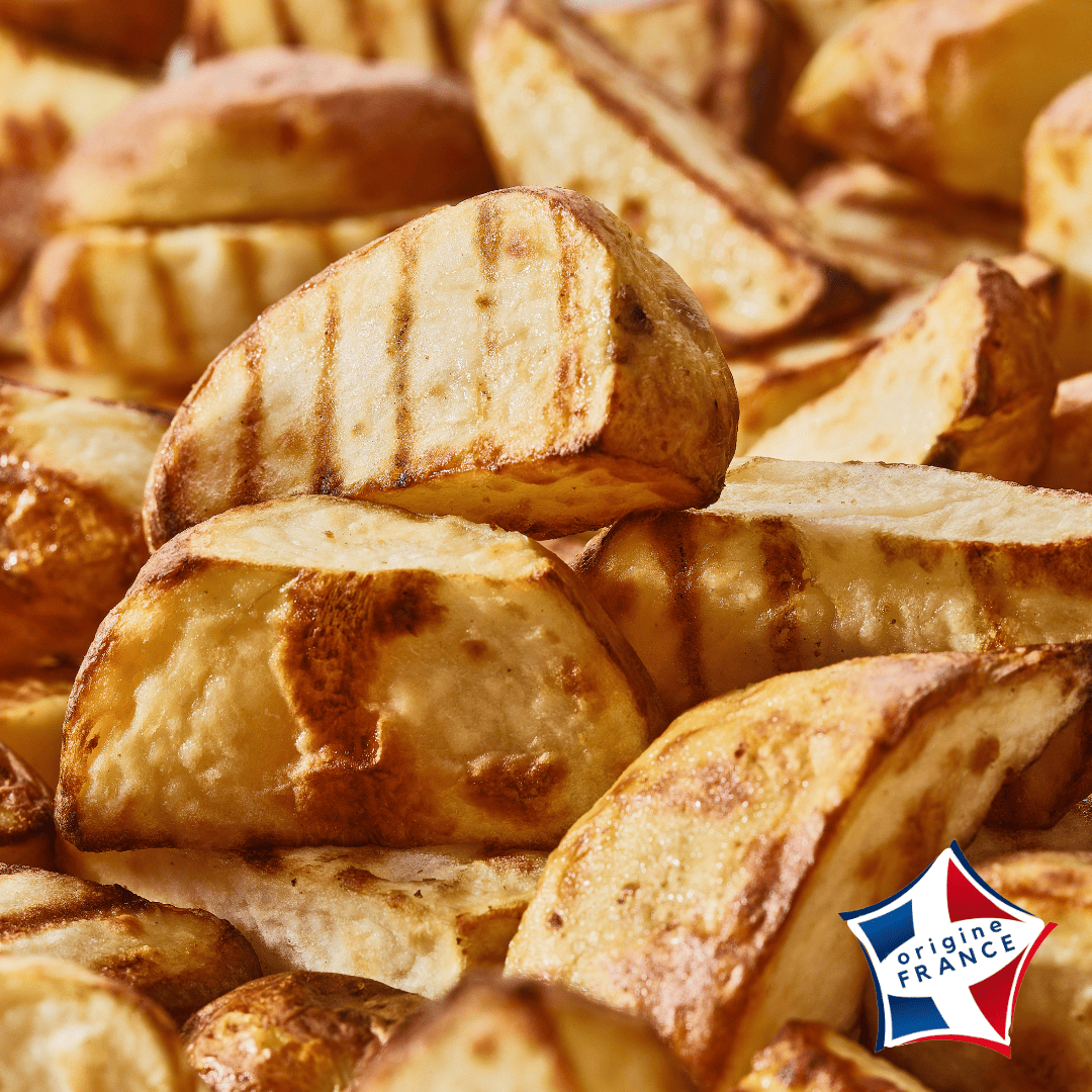Pommes de terre rôties, récoltées en France, découpées en généreux morceaux et préparées à l'huile végétale.