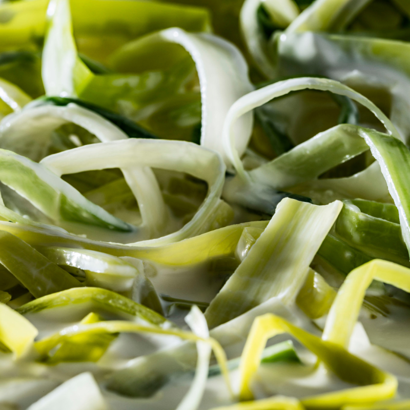 Palets d'émincés de poireaux à la crème, gamme spéciale mono produits, légumes fraîchement récoltés, lavés, triés et cuisinés.