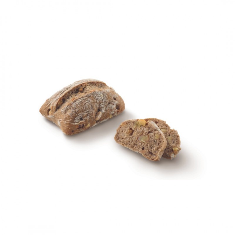 Ce petit pain noisette L 8.5 x l 5.5 x E 4cm ± 1cm est préparé avec de la farine dé blé, agrémenté de noix et de noisettes, produit Clean Label.