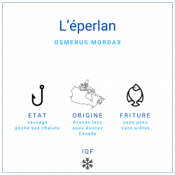 Friture d'éperlans IQF, "Osmerus Mordax" poissons entiers de L 5 à 9cm, pêchés aux chaluts dans les eaux douces des grands lacs du Canada.