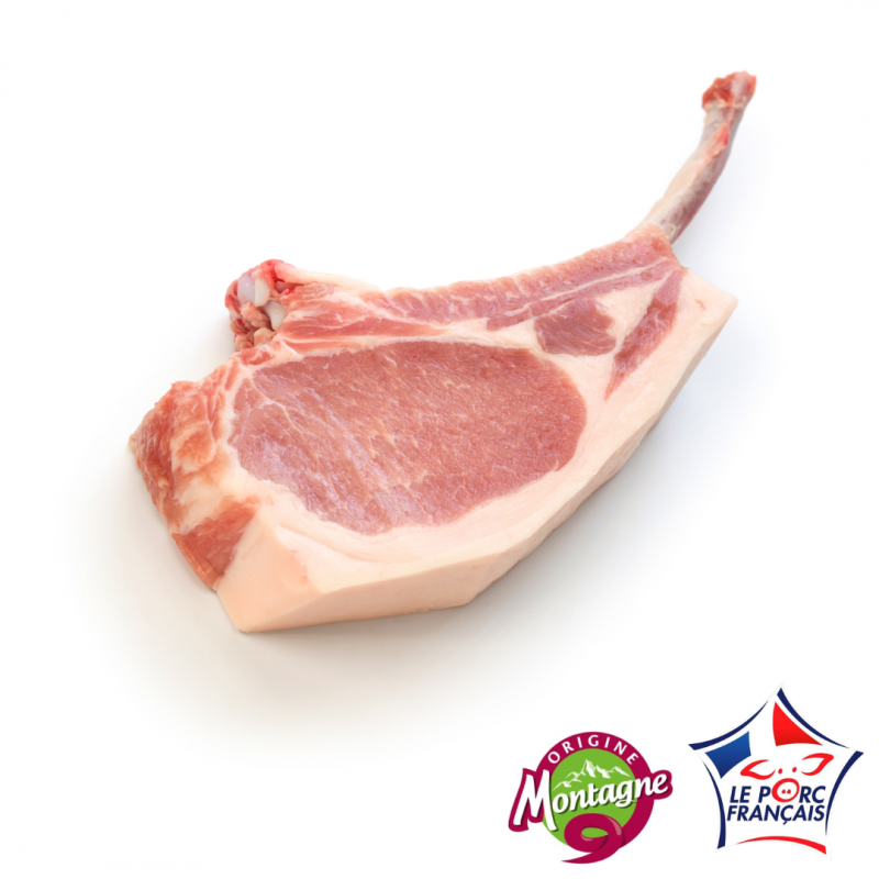 Côtes de porc filet, morceau cru et issu de longes détalonnées, manchonnées et sans chainettes, tranchées à la feuille, certifié Le Porc Français de la démarche Montagne.